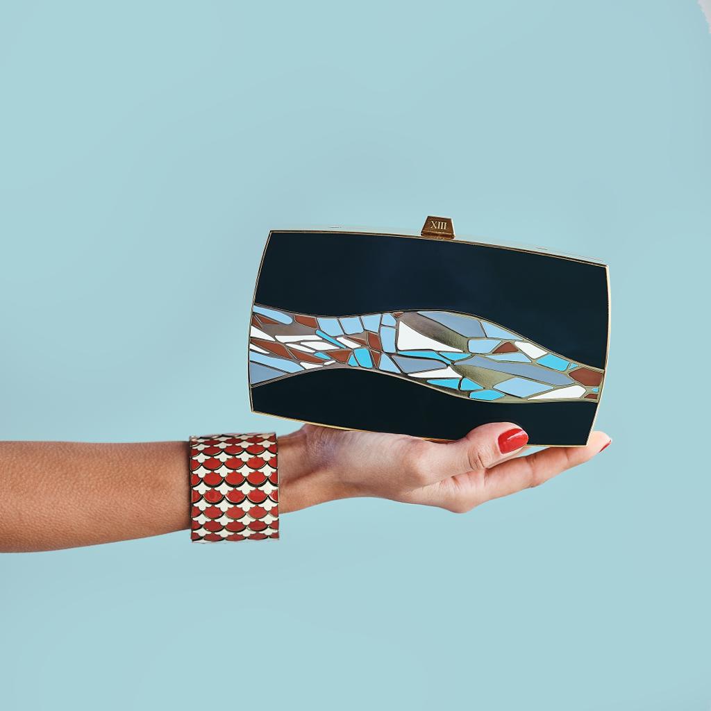 Bag #5 is called “The First Wave”. It is both a visual interpretation of that first time she sets her eyes on the crystal-clear ocean, but also an expression of that first wave of freedom that runs through her body, and that fills her with hope & relief.