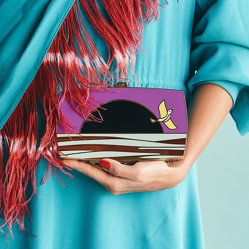 As if to draw in the dawn of a new day, bag #11 “The Sunset” comes in to portray this woman who is not only getting ready for a night out on Isla Mujeres, but who is blending seamlessly into the sun, letting herself be guided by its rays of light into a new horizon, a new vision… A new eternity filled with possibility.