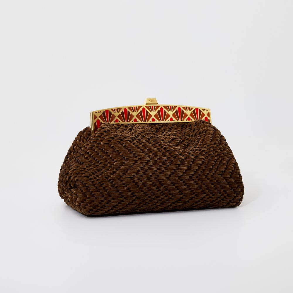 The energy of creativity is unveiled in the Fire clutch, designed in earthy tones. The varying shades of brown knitted suede complement the red enameled hues, complete with a gold-plated clasp.